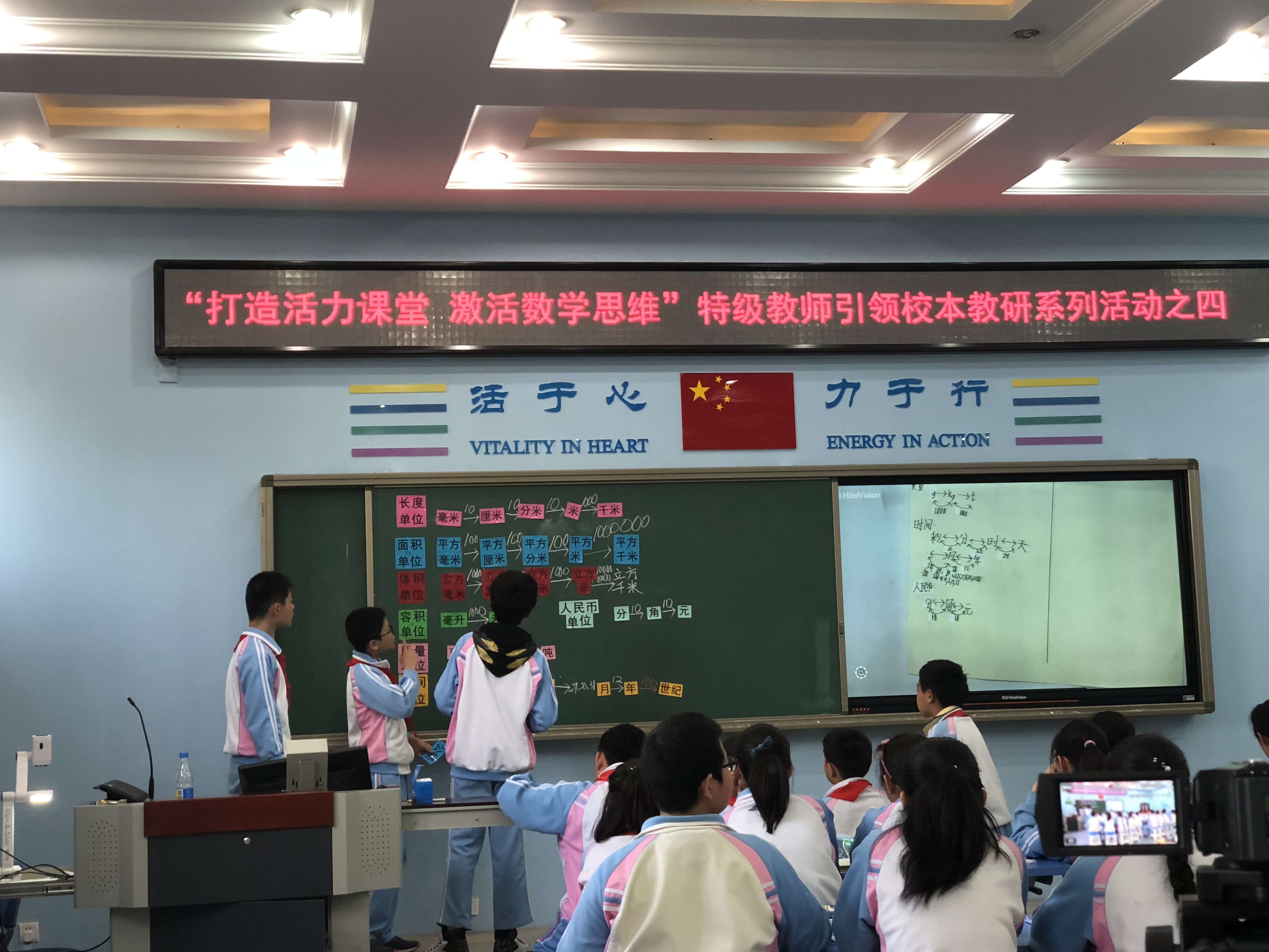 第二节是六年级洪润姣老师执教的一节复习课《常见的量》。本节课以新闻播报的形式导入,在训练学生倾听的同时培养学生的阅读素养,引导学生发现生活中多样的计量单位,从而引出课题对常见的量的整理。此外,洪润姣老师还安排了课前整理计量单位的任务,并在此节课中设计了小组讨论交流补充的环节。