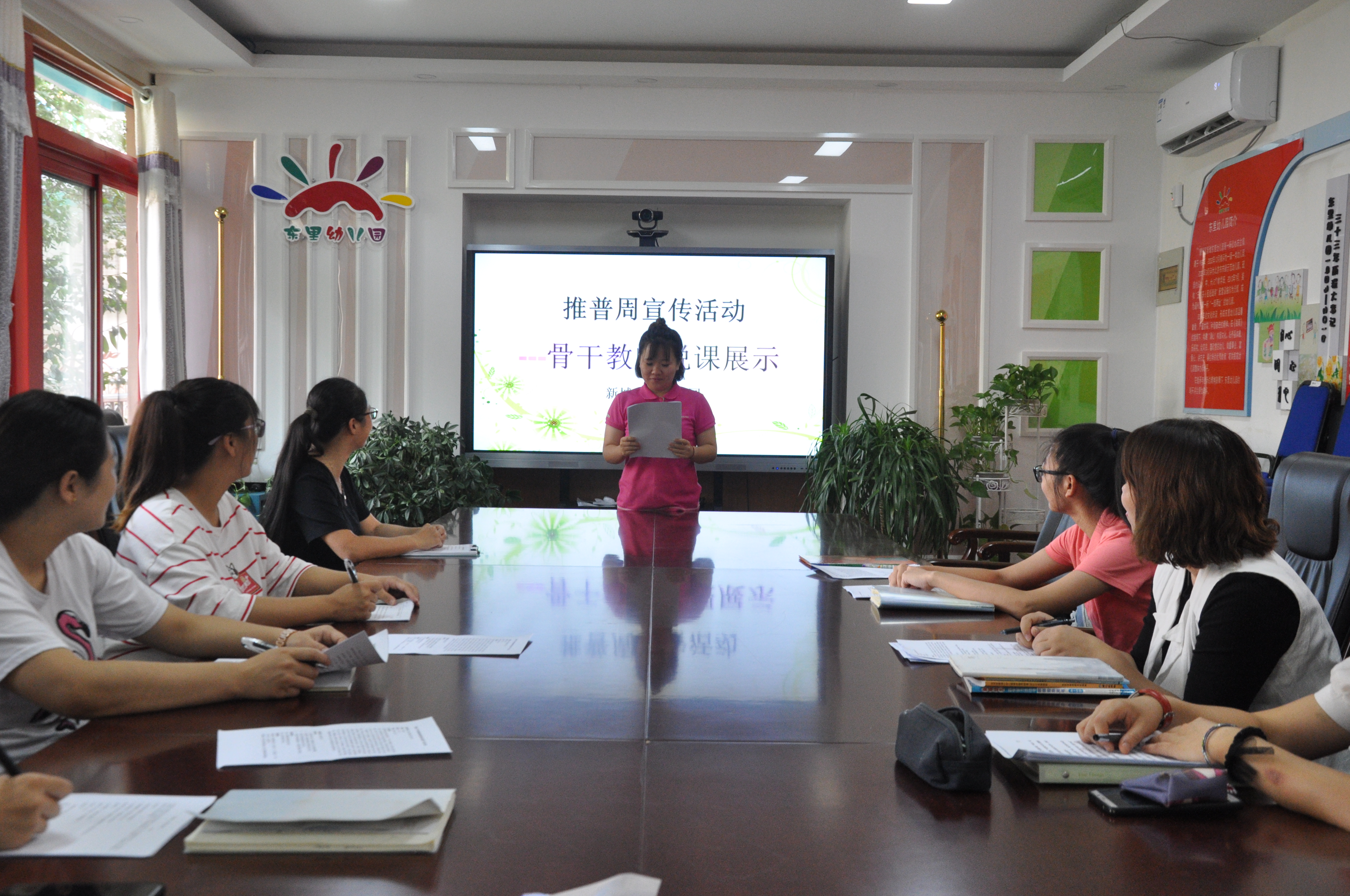 为了更好地促进幼儿园语言文字工作,新城东里幼儿园围绕“说好普通话,迈进新时代”这一宣传主题,结合本园情况,于2018年9月13日组织全体6年以上教龄的骨干教师进行说课展示活动。