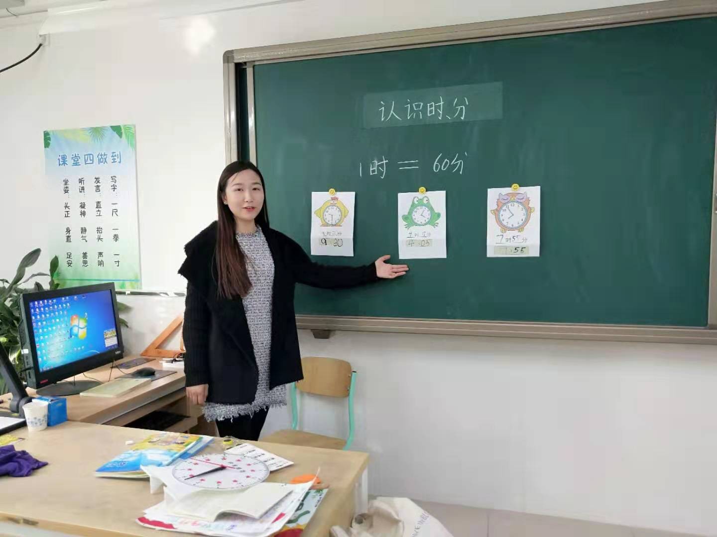 李思雨老师教授的内容是《认识时间》。李老师的课堂语言简单明了,能用学生容易理解的语言去描述知识,让学生易于接受。在教学过程中尽可能地联系生活实际,使用学具、课件演示等,帮助学生在观察、操作中掌握知识。
