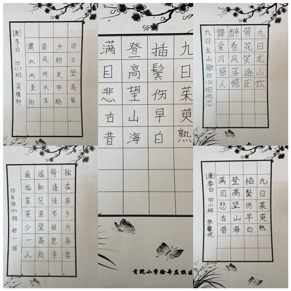 三、四年级的同学们在践行“四个一”的同时,还抄写了与重阳节有关的诗词,加深对传统文化的理解与感悟。