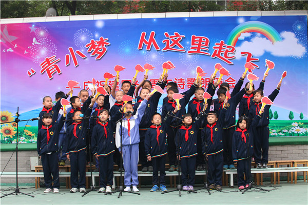 为了庆祝祖国母亲64周年华诞,激发师生饱满昂扬的爱国热情,努力营造和谐向上、健康文明的校园文化氛围,以激情昂扬的诗篇营造良好的校园精神风貌。北京市西城区青年湖小学于9月30日举办了以“青小梦 从这里起飞”为主题的诗歌朗诵会。