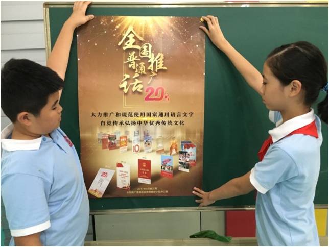 队员们在校园内张贴推普周宣传画,在学校电子屏展示宣传标语,渲染了推普气氛,扩大了推普宣传的影响。并利用学校广播站进行了“推广普通话,做文明小使者”的专题广播。活动中,语言文字志愿服务队的同学们手拿“推普”宣传单,走进班级,向同学们进行“说普通话、写规范字、做文明人”的宣传活动。