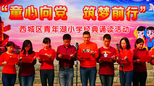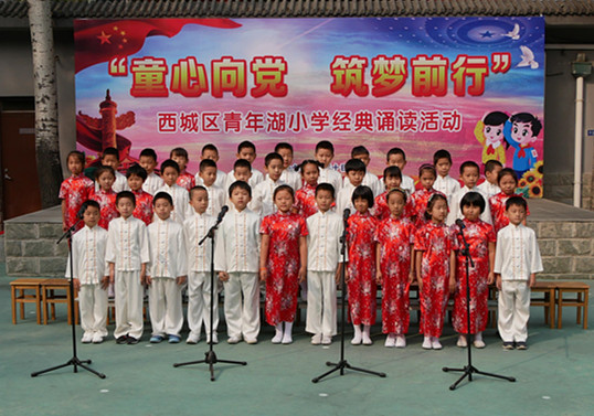 为了庆祝祖国母亲68周年华诞,激发师生饱满昂扬的爱国热情,营造良好的校园精神风貌。北京市西城区青年湖小学于2017年9月30日开展了“童心向党筑梦前行”经典诵读活动。