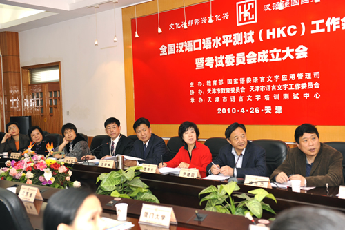 本报讯 4月26日,全国汉语口语水平测试工作会议在天津市语言文字培训测试中心召开。会议由教育部语用司普通话推广处处长容宏主持。会上成立了第一届全国汉语口语水平测试考试委员会,国家语委副主任、教育部语用司司长王登峰和天津市教委副巡视员张向阳为汉语口语水平测试考试委员会揭牌。北京、天津、上海、重庆及江苏、福建、山东、广西8省(自治区、直辖市)及武汉市成为首批开展汉语口语水平测试试点工作的省市。试点省市的考生将在今年率先参加测试,获得由国家语言文字工作委员会颁发的汉语口语水平测试等级证书。北京市语委副主任曹秀云、北京市语委办主任贺宏志、北京市语言文字测试中心常务副主任杨学军代表北京市语委参加了会议。