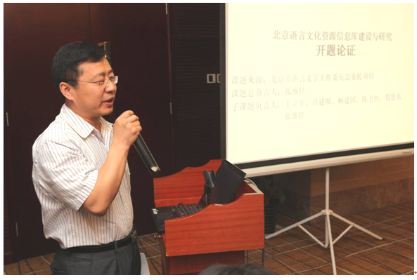 北京语言大学科研处处长、北京语言文化建设中心主任、“北京语言文化资源信息库”建设项目首席专家张维佳教授重点阐述了项目研究的意义和价值、研究框架和研究目标、研究方法。他认为北京语言文化资源信息库建设对于推动北京作为全国文化中心的建设工作,对于北京非物质文化遗产保护和传承独具地方特色的京味文化,丰富现代北京人的文化生活等具有重要的意义。该项目包括6个子项目:北京口传语言文化资源信息库、北京话及普通话吟诵资源信息库、北京皇家园林庙宇楹联牌匾资源信息库、北京地名文化资源信息库、北京语言文化图典资源信息库、北京外语使用情况信息库。