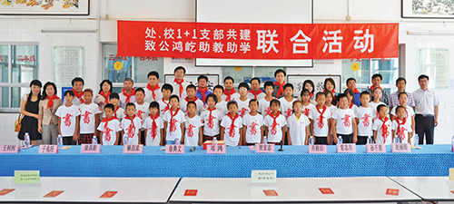 7 月5 日,市教委语言文字工作处党支部、密云县东邵渠镇中心小学党支部“1+1”共建,在东邵渠镇中心小学举行“致公鸿屹助教助学活动”。市人大代表、西城区人大常委、致公党北京市委常委、致公党西城区委主任、市教委语言文字工作处处长贺宏志,市教委语言文字工作处支部书记、调研员邓鸿,中共密云县委统战部副部长齐殿臣,致公党市委、西城区委代表以及致公党西城区第十五支部主委、市青联委员、活动捐助者赖昌凉出席了活动。与会代表还有密云县教委、县语委、东邵渠镇政府领导以及“处、校1+1”支部成员、教师代表、家长代表、学生代表。活动举行了颁奖仪式,奖励了30 名优秀学生。“致公鸿屹助教助学活动”为期三年。语言文字工作处党支部将结合群众路线主题教育,加强支部建设,拓宽“1+1”支部共建渠道,创新共建方式,进一步深入基层,更好地为基层服务。