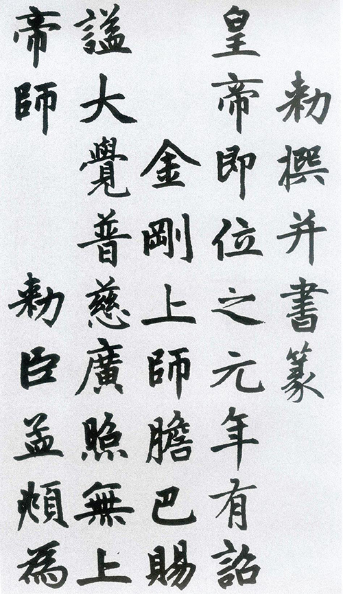 赵孟頫楷书帝师胆巴碑卷, 纵33.6 厘米, 横166厘米,纸本。书于延祐三年(1316 年)。卷后有清姚元之、杨砚、李鸿裔、潘祖荫、王懿荣等人跋。钤有清许乃普等人收藏。《东图玄览》《清河秘箧表》《南阳名画表》《式古堂书画汇考》等书著录。现藏故宫博物院。