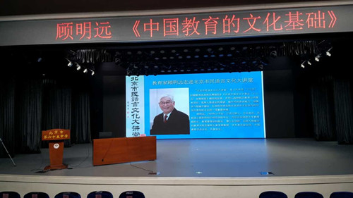 6月28日下午,“北京市民语言文化大讲堂”走进北京市第65中学,邀请我国著名教育学家、中国教育学会名誉会长、北京师范大学资深教授顾明远先生,以“中国教育的文化基础”为题,参会人员以东城区为主,全市各区派代表,面向语言文字规范化示范校的领导和骨干语文教师共400余人,举办了专场报告会,并进行了网络直播。市教委、市语委副主任李奕出席报告会。报告会由市语委办公室主任贺宏志主持。东城区教委为活动的成功举办提供了有力的支持。