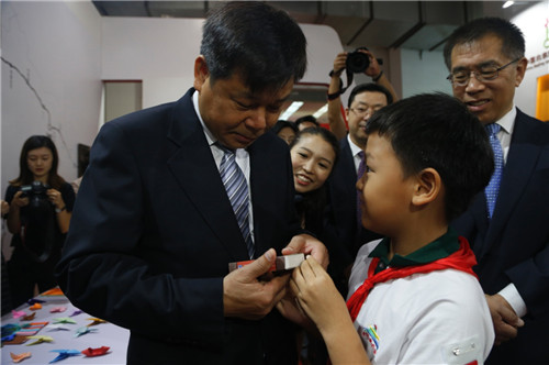 安外三条小学的学生向王宁副市长赠送成语扑克