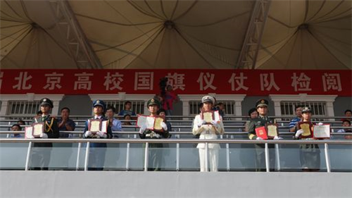 北京高校国防教育协会常务副理事长刘兆武宣布获奖名单。与会领导为在北京高校第四届国旗仪仗队竞赛中的获奖高校颁发了证书、奖牌。