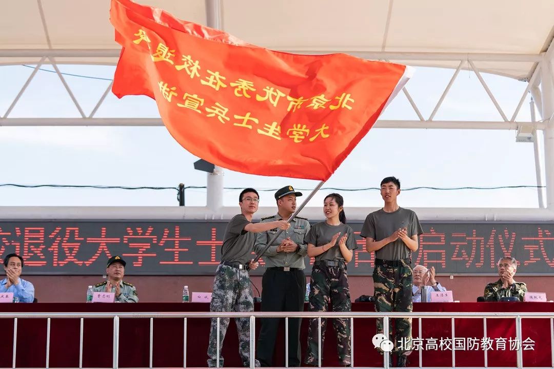 斌为北京市优秀在校退役大学生士兵宣讲团授团旗,并宣布2019年北京高校征兵宣讲活动正式启动。