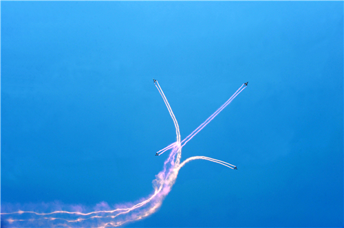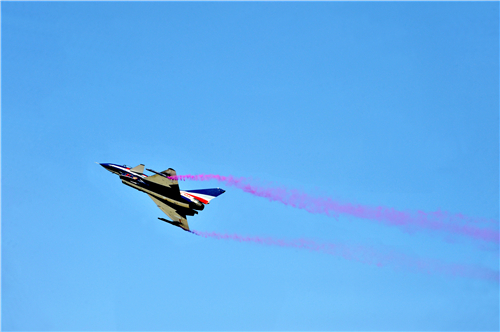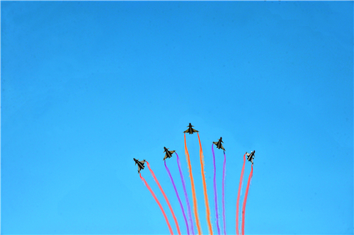 14时30分,飞行表演正式开始,6架迷彩歼十飞机腾空而起,进行了单机大仰角、双机对头剪刀叉、三机斜筋斗翻转、四机大坡度旋转、五机空中开花、六机三角队密集通场和连续倒飞、低空横滚翻转、超低空通场、编队开花等特技表演。空军精湛的飞行表演赢得了现场师生阵阵热烈的掌声和惊呼声。表演结束后,同学们零距离参观了该师装备的歼十表演机。
