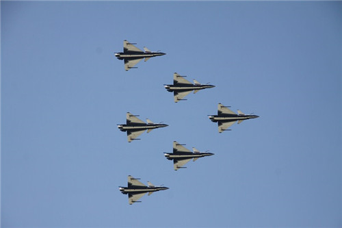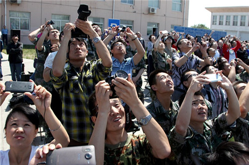 5月16日上午20余所700多名师生前往天津杨村机场观看空军24师八一飞行大队新式战机表演。