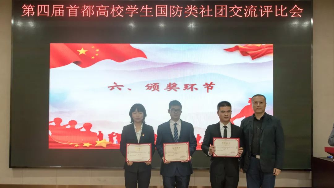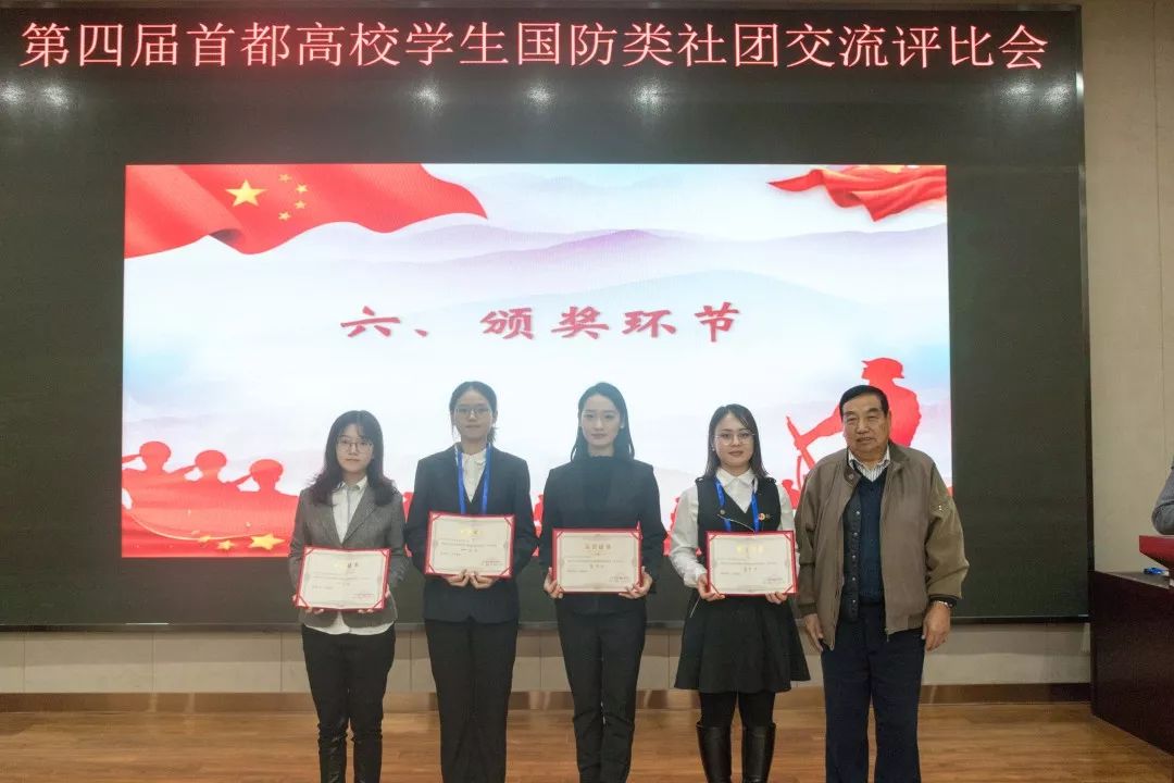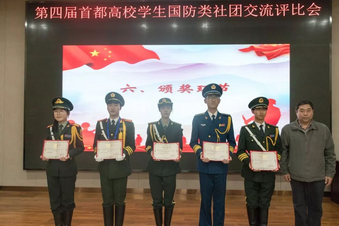 经专家评审,北京科技大学国防体育协会、国防知识爱好者协会,北京化工大学国旗护卫队、旌旗中队分别荣获国防体育类、国防军事类、国旗教育类、退役士兵类2019年北京高校国防类学生社团交流活动一等奖。到会领导与专家向获奖社团颁发了获奖证书。
