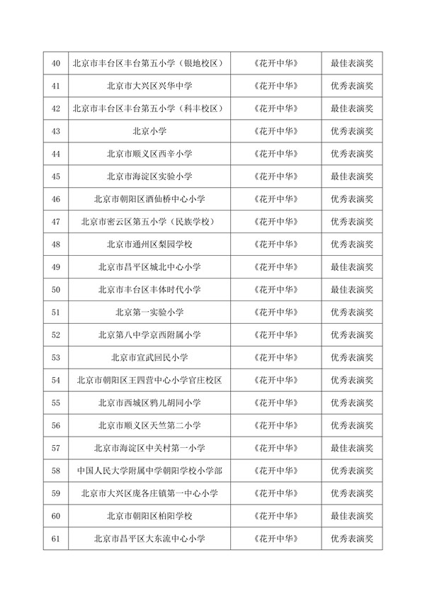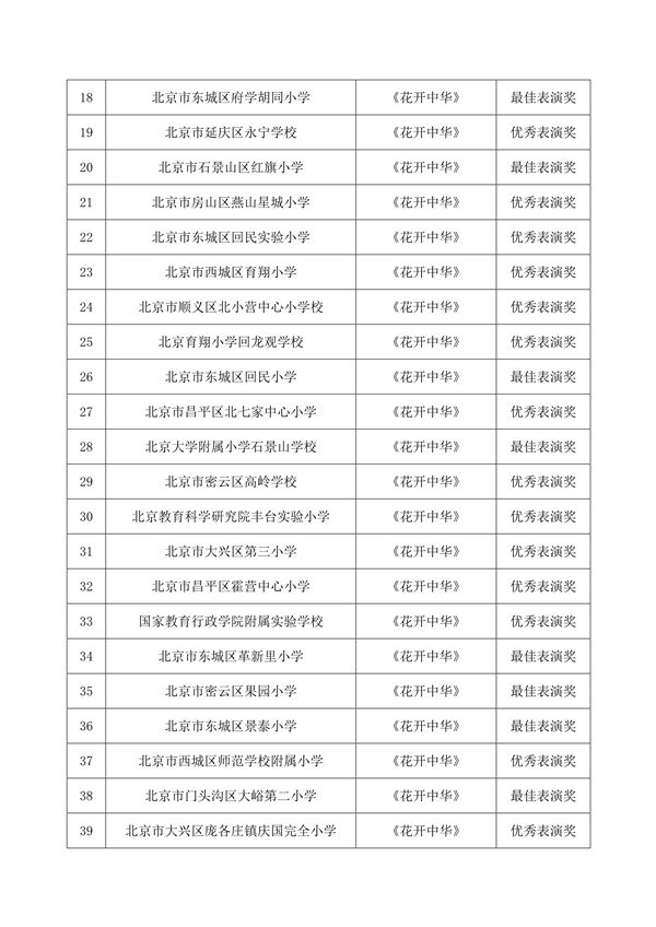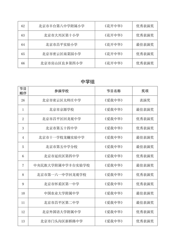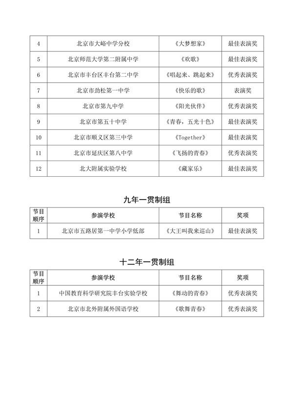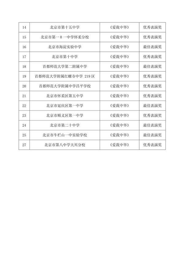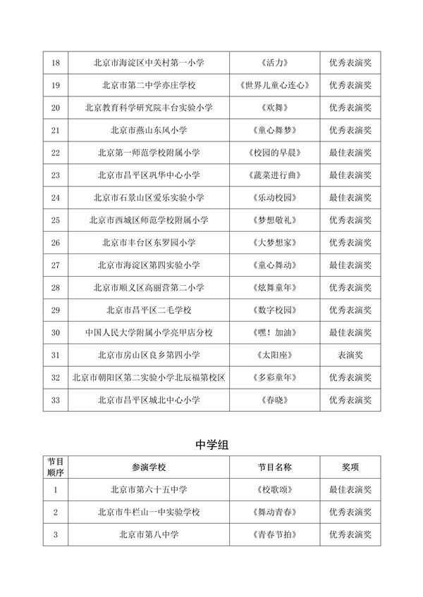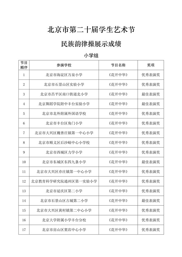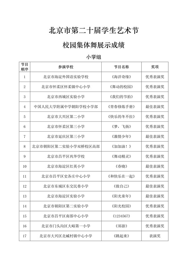 按照《北京市教育委员会关于举办北京市第二十届学生艺术节的通知》(京教函[2016]477号),2017年11月2日至3日举行了北京市第二十届学生艺术节校园集体舞和民族韵律操展示活动,经专家评定,最终评出校园集体舞最佳表演奖 17 个,优秀表演奖 28 个,表演奖 3个;民族韵律操最佳表演奖 31个;优秀表演奖 61 个,表演奖 1 个。