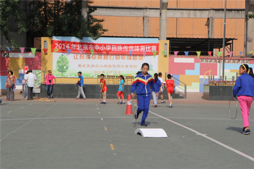 2014年5月17日,“2014年北京市中小学民族传统体育比赛”在北京市朝阳区安贞里第二小学举办。本次比赛项目有空竹、打花棍、铁环、陀螺、踢毽、投壶、射箭、二人大板、珍珠球、三项全能(踢毽-投壶-铁环),其中投壶、射箭、三项全能为新增项目。来自全市的22所中小学600多名学生参加了比赛。比赛圆满完成,北京教育学院石景山分院附属学校和朝阳区安贞里第二小学,分获中小学团体总分第一名。