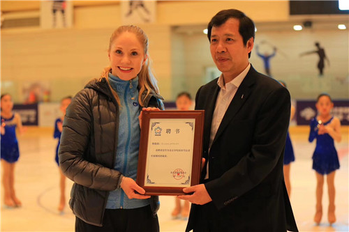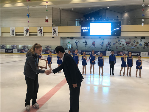 北京小学长阳分校是房山区的一所普通学校,他们已经开展冰雪运动近两年,部分孩子已经有了一定的滑冰基础,对于这次的队列滑培训,老师和孩子们觉得非常有意义,之前的一些问题通过今天的培训交流迎刃而解,孩子们也通过与劳拉的“亲密接触”,在技术动作上得以提高。在去年的北京市第二届中小学生冬季运动会开幕式上,劳拉同奥运会冠军韩晓鹏、世界冠军陈露、佟健等一起被市教委聘为北京市中小学校园冰雪运动专家顾问团成员。利用在北京小学长阳分校开展活动的机会,市教委体卫艺处王军处长特意前来将代表荣誉和责任的专家证书颁发给劳拉。