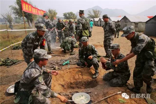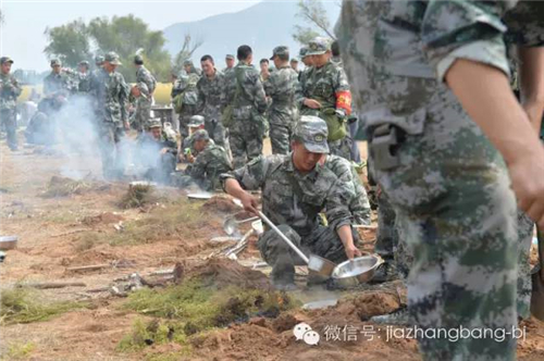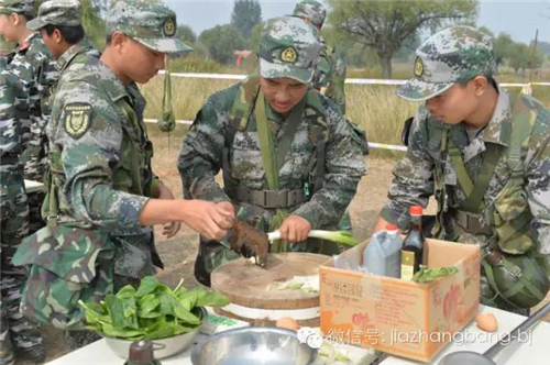 此时已近中午,吃饭又成为队员们面临的问题。指挥官一声令下,几个班的队员三人一列排好队。一人负责去野外寻找柴火,另外的两名学生开始挖坑埋灶,自己做西红柿鸡蛋挂面。因为是第一次,大部分的学生都不熟练。有的锅里烧水时掉进了一层土,有的则是火太大,导致灰烬飘进了水里,都不得不重新再来。一切就绪后,学生们开始煮挂面。除了面,特训营的厨师还在现场用现代化的军事设施为学生们制作了炒菜和米饭。
