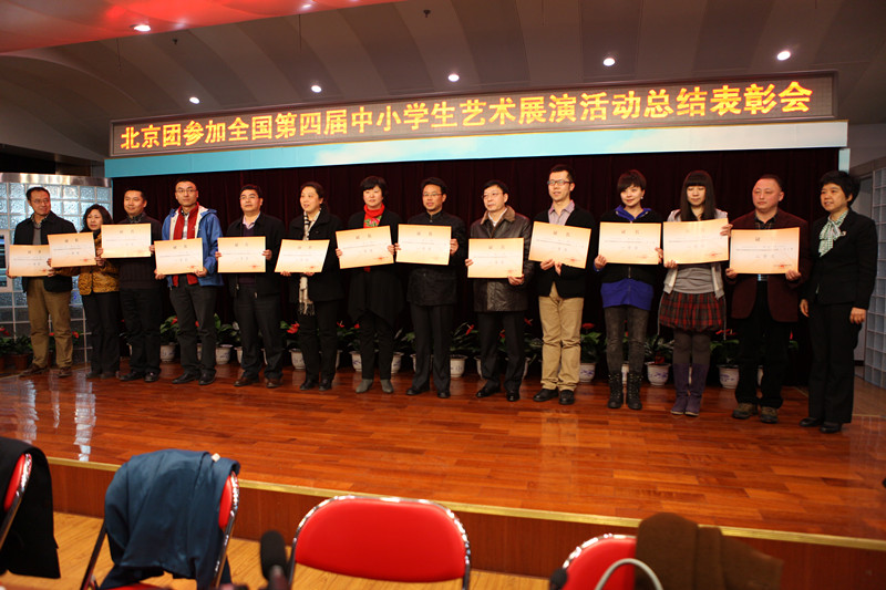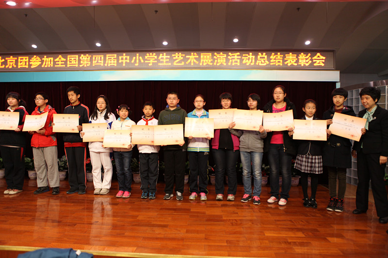 2013年3月29日北京团参加全国第四届中小学生艺术展演总结会,在北京市东城区少年宫隆重举行,活动由教育部主办,厦门市政府承办。此次展演活动以“阳光下成长”为主题,来自全国31个省、市、自治区6000余名师生代表参加了展演活动。188个丰富多彩、形式多样的器乐、合唱、舞蹈、校园剧、朗诵节目参加了艺术表演类的现场展演。活动期间,还举办了艺术作品展览、艺术教育论文报告会、校长美育论坛、阳光踩街等活动。北京代表团参加了全部展演活动,充分展现了我市中小学生素质教育教学成果和广大青少年学生文明、进取、协作、创新的精神面貌,达到了预期的目标。