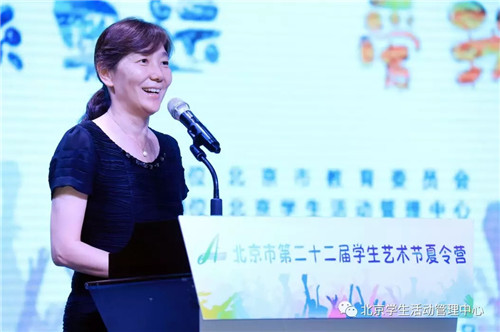 我中心副主任张京华在开营式上致辞。她希望营员们可以在缤纷多彩的营地生活中绽放自己的活力与风采,收获属于自己的夏季芬芳与记忆,并强调说,中心一直以立德树人为根本任务,积极探索学校美育的改革发展,努力提升中小学生的综合素养。