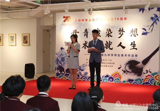 此次师生美术作品展是顺义九中为庆祝新中国成立七十周年而举办,早在五月份就开始筹备,师生们精选出以前的一些优秀作品,近期又创作了很多优秀作品,心中饱含着对伟大祖国的无限热爱,对画展进行了精心准备,最后遴选出教师作品160件、学生作品50件进行了布展。师生们用画展的方式、用对美的艺术的表现形式,来表达对伟大祖国的真挚爱心和深深祝福。
