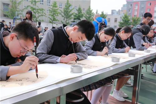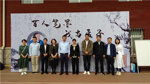 2019年5月8日上午,首都师大二附中汇聚了昌平区、延庆区、海淀区的书法老师们,举办了一场以“百人笔墨,我与孟子”为主题的三区联动教研活动。在这场文化饕鬄盛宴中,首师大二附中初一年级一百名小书法家和来自昌平区燕丹学校的学生们齐聚操场,进行现场书写展示。此次莅临我校的嘉宾有首师大中国书法文化研究院院长解小青教授、书画频道书法讲堂主讲教师张站立老师、北京市金帆书画院吴蔚老师、海淀区艺术中心主任杜磊老师、延庆区书法教研员刘利明老师、昌平区书法教研员朱俊达老师、海淀区书法教研员耿国华老师。