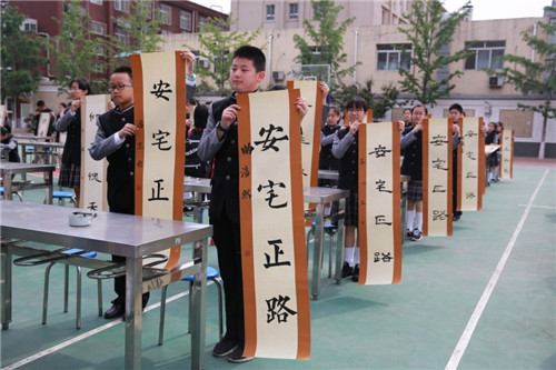 一支支俊秀的毛笔,一方方雅致的砚台,一排排整齐的案几……平日以运动为主旋律的操场俨然成为兰馨书房。入场时,一百名同学庄重入场,以饱满的精神状态,等待嘉宾和老师们的到来。随后俊美学子们伴随着悠扬的古琴曲,缱绻笔墨, 用心书写每一个笔画、每一个汉字。同学们握笔正确,坐姿端正,表现出良好的书写习惯,所写作品笔画流畅,横平竖直,结构匀称,整体美观。这次展示不仅是同学们才华的展示,更是对孟子精神的诠释。孟子精神激励我们做到“以仁居心,以义行事”,做人要坦坦荡荡,问心无愧。这一隅宣纸上用浓墨写出的书法作品,更能让我们用心去领悟孟子超凡脱俗的境界,并把孟子精神化作一件件小事融入学生的成长道路中。