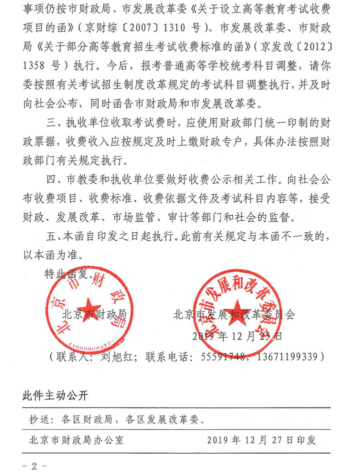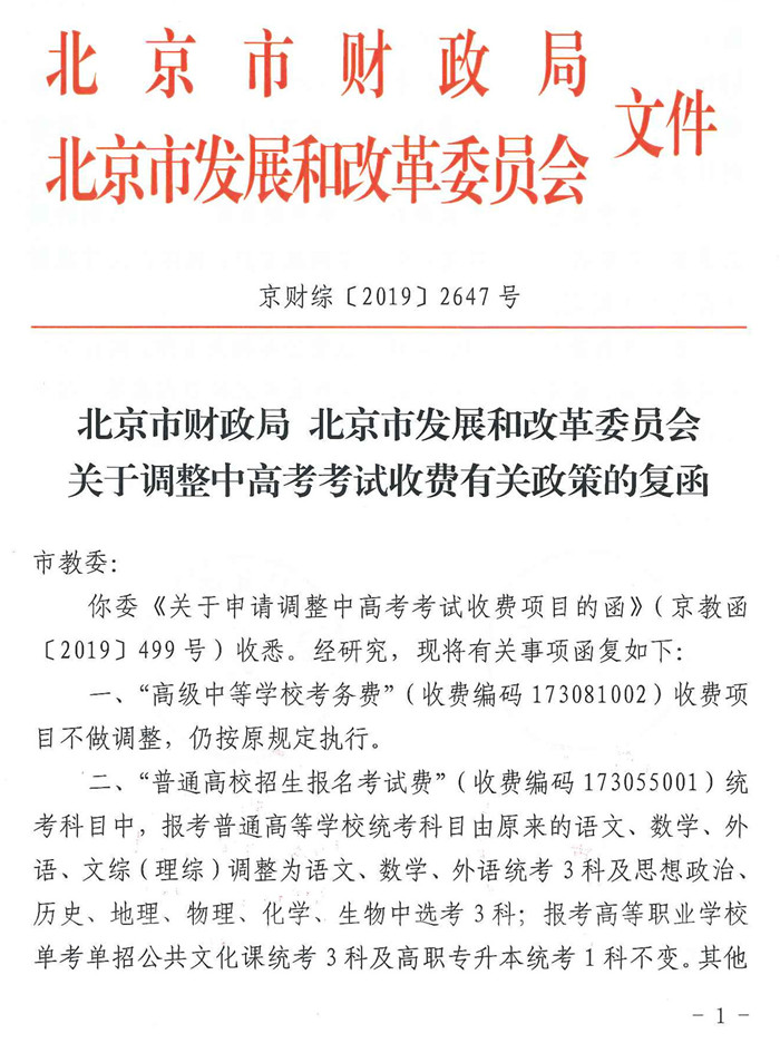 北京市财政局北京市发展和改革委员会关于调整中高考考试收费有关政策的复函