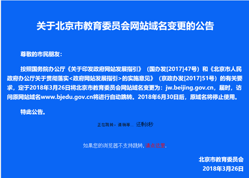 按照市政府办公厅对市级部门网站域名分配,市教委组织制定《域名调整工作方案》,定于2018年3月26日实施网站域名技术切换。为确保网站服务的延续性,依据“指引”要求,提前在市教委首页显著位置发布“公告”,预先提示网民域名变更工作安排,公示时间超过60天。在域名切换当日,在原有域名地址设置公告提示并自动跳转,保证新旧域名无缝过度(如下图)。