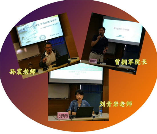 随后,孙震老师做了《把握方向,关注课堂,平稳过渡改革年》的主题讲座,从中考改革回顾、后续改革方向、多学科考试特点、中考后的反思和改革与新初三工作等五个方面进行了阐述。北京教育学院丰台分院曾拥军副院长做了题为《考试评价与命题》的讲座,从测验分类、考试命题的一般原则、试题分类等方面高屋建瓴的进行了剖析。刘青岩老师做题为《以考促改,思变求真》的讲座,剖析了命题的意义,中考改革的方向及试题试卷分析,从中找准今后教学教研教改的方向、途径。