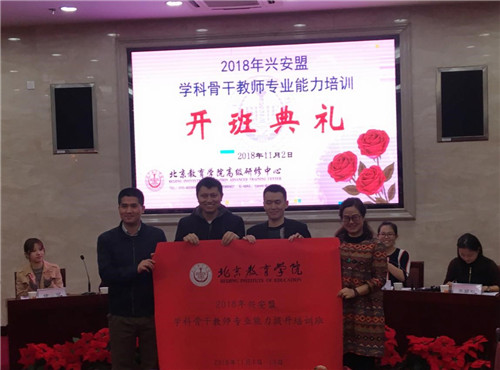 11月2日上午,2018年兴安盟学科骨干教师专业能力提升培训班在北京教育学院中轴路校区顺利开班。北京市教委对口支援与经济合作处贺捷副调研员、北京教育学院高级研修中心陈丽主任、北京教育学院《丛书》办主任邢素丽、兴安盟教育局基础教育科贾宏宇老师、兴安盟教育局人事师资科徐可老师参加开班仪式。