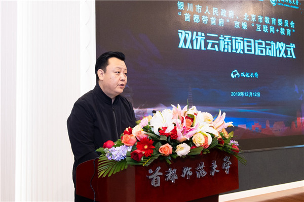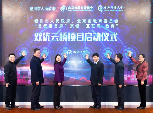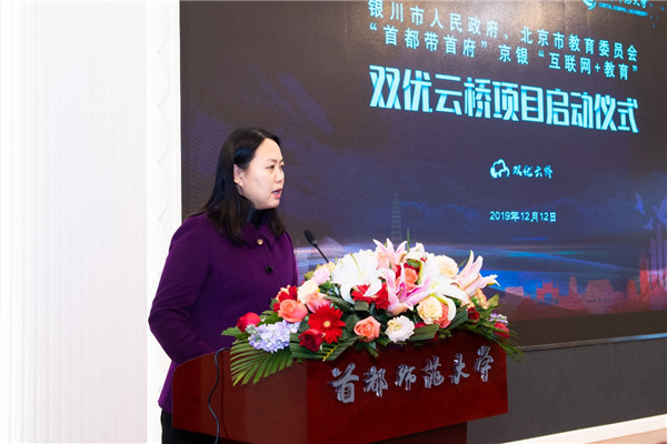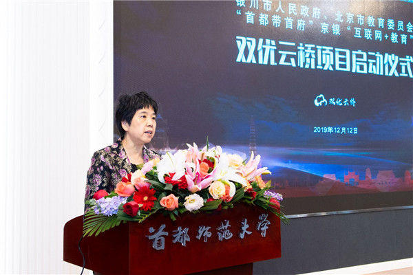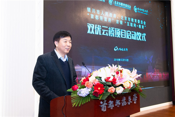 为进一步加强北京银川两地教育合作,促进首都教育精准帮扶转型升级,助力宁夏“互联网+教育”示范区建设,深化“首都教育远程互助工程”。12月12日上午,在首师大实验楼报告厅举行“首都带首府”“互联网+教育”首师大双优云桥项目启动仪式。首师大党委书记郑萼、银川市副市长陈艳菊、首师大副校长李有增、首师大副校长李小娟、银川市政府副秘书长虎峰、北京市教委扶贫支援处处长王力志等领导同志出席,校、地有关部门负责同志参加。仪式由王力志同志主持。