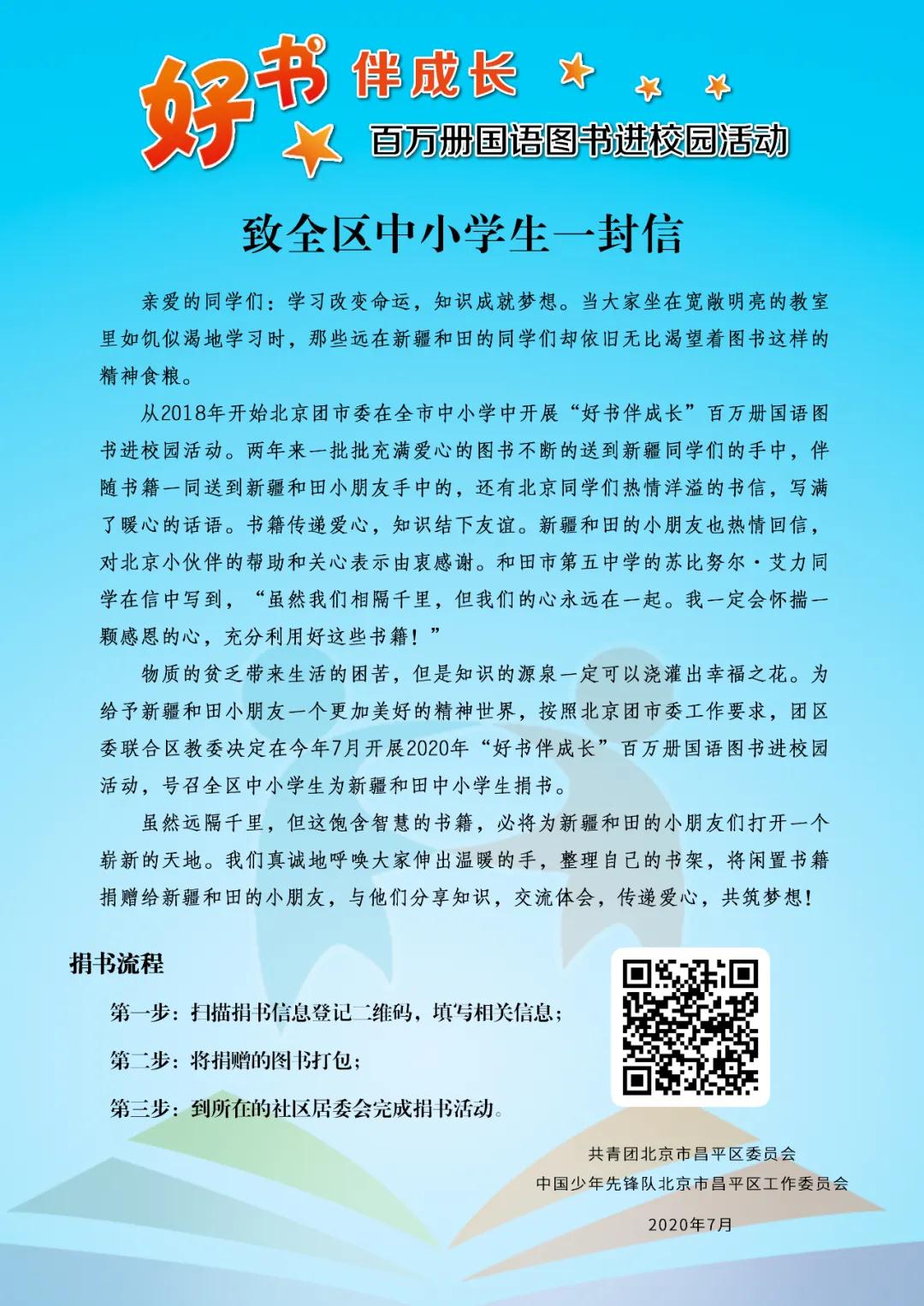 7月底,昌平团区委、区教委共同开展“好书伴成长”活动,为新疆和田地区中小学生捐赠图书。