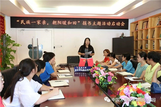中国人民大学朝阳幼儿园曹书记和李园长在图书捐赠动员会上将此次捐书活动作为思想政治引领和价值引领的重要内容,对全体教职员工进行互助友爱、民族团结教育,带领全体教职工充分认识了捐赠图书活动的重要意义,鼓励教职工们积极参与!