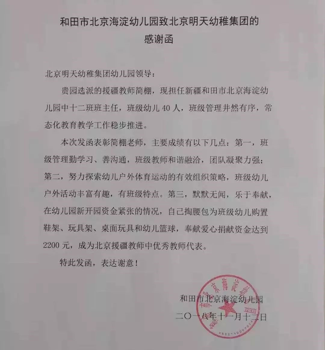 和田市北京海淀幼儿园也特意发来感谢函,感谢简老师的付出。