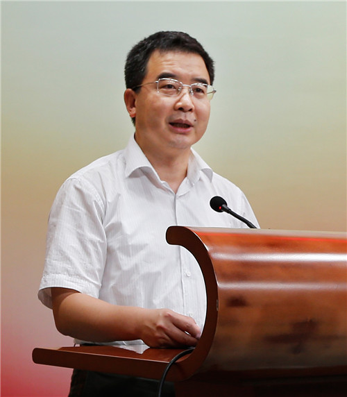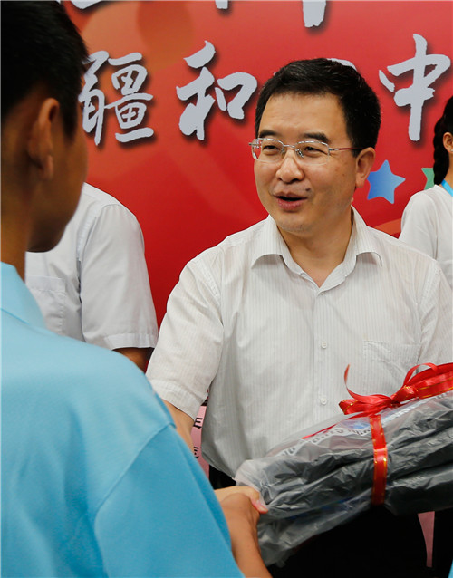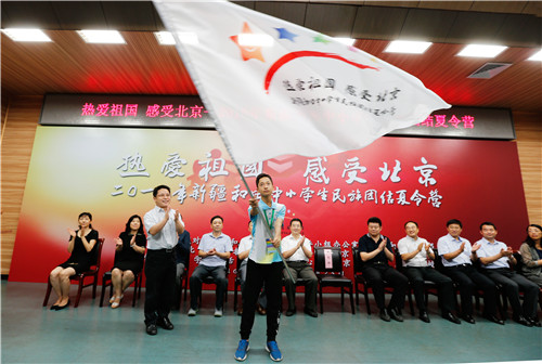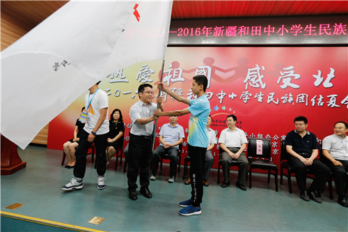 市援疆和田指挥部副指挥王想平宣布夏令营开营并向营员代表授营旗。