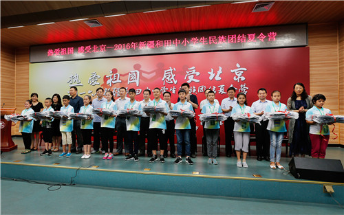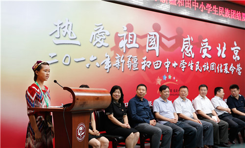 7月16日上午,“热爱祖国,感受北京” 2016年新疆和田中小学生民族团结北京夏令营在北京市盲人学校正式开营。市教委副主任李奕,市援疆和田指挥部副指挥王想平,市支援合作办、新疆和田驻京联络处、北京学生活动管理中心、北京市盲人学校等有关负责同志以及来自新疆和田地区的190名中小学师生出席。