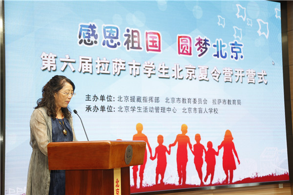 7月26日上午,由北京学生活动管理中心承办的“感恩祖国·圆梦北京”2016年西藏拉萨中小学生北京夏令营在北京市盲人学校开营。西藏拉萨体育局副局长毛雅丽、北京学生活动管理中心副主任史建华、北京市盲人学校副校长郭季等领导出席活动。