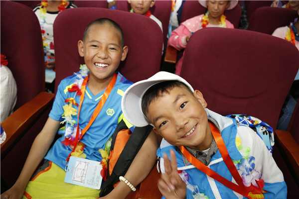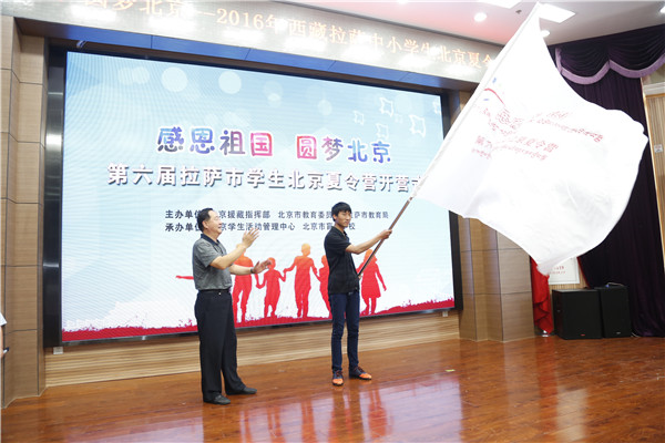 北京学生活动管理中心副主任史建华为孩子们授营旗并宣布2016年西藏拉萨中小学生北京夏令营开营。随后,拉萨市教育局和北京学生活动管理中心共同向学生代表赠送礼物。