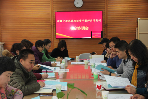 近日,2018年新疆少数民族双语骨干教师实习实训协调会在首都师范大学京疆学院召开,将启动学员入校实习实训环节。市教委支援合作处副调研员贺捷,京疆学院院长赵云云、党总支书记林广成、副院长沈晓非,海淀区教委人力资源科副科长刘伟,房山区教委人才中心郭建以及各实训学校负责同志参会。