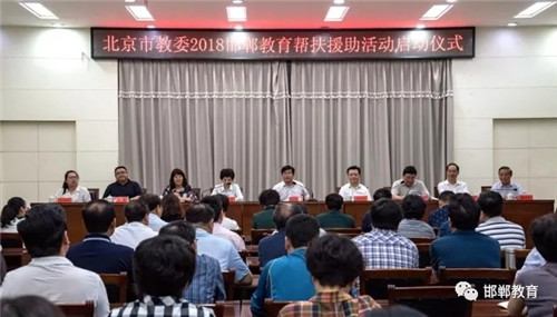 5月14日下午,北京市教委2018邯郸教育帮扶援助活动启动仪式在邯郸市教育局举行。北京市教委对口支援与区域合作处处长王力志,北京教育学院培训管理办公室主任方怀胜,邯郸市教育局局长杨华云,邯郸市教育局副局长李瑄,邯郸市教育考试院院长曹建召,北京鸿德教育科学研究院院长魏续臻,北京市东城区工商联副主席陈强,北京问学研究院副院长李思洋以及来自北京市优质学校9大学科专家教师出席仪式。启动仪式由邯郸市教育工委副书记、市教育局副局长赵小丁主持。