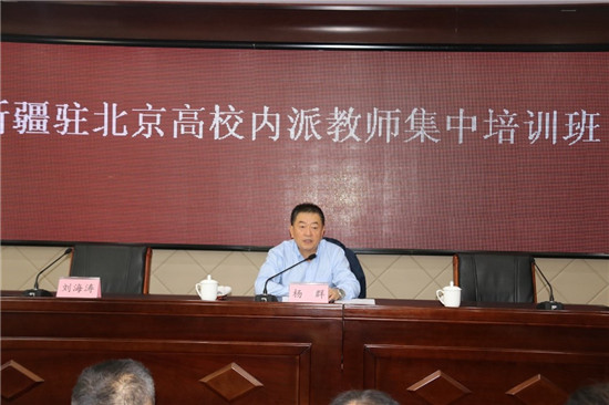 为深入贯彻落实党中央和北京市关于抵御和防范宗教极端思想渗透工作的精神,全面加强北京高校新疆籍少数民族学生教育、管理、服务工作,切实提高新疆籍少数民族学生人才培养质量,10月23日至26日,北京市教委对口支援与区域合作处与新疆驻北京教育协调小组在北京市教工休养院举办新疆驻北京高校内派教师培训班,培训分为专家讲座、专题报告、小组讨论等形式。北京市教育委员会对口支援与区域合作处处长王力志、新疆驻北京市工作组党委书记、工作组组长王龙德、副党委书记、工作组副组长杨群、新疆驻京工作组党委副书记、教育小组组长刘海涛及新疆驻北京高校82名内派教师参加了此次培训。