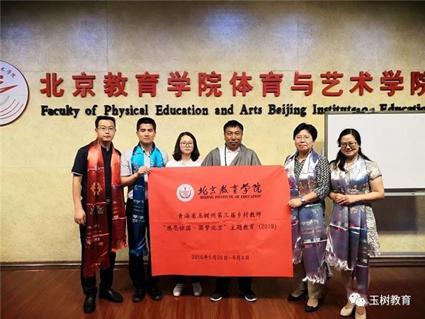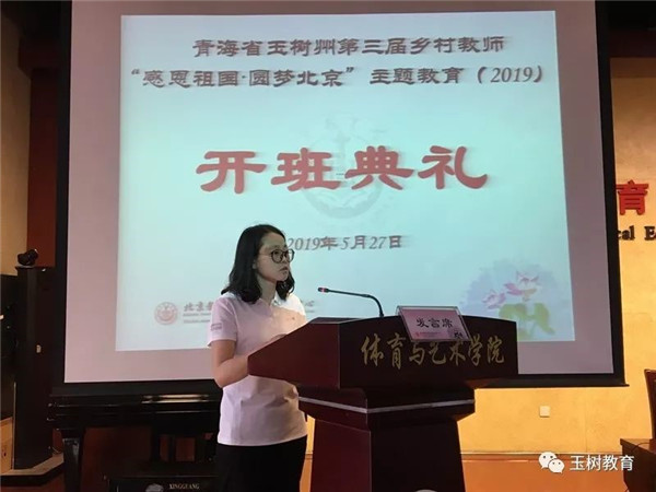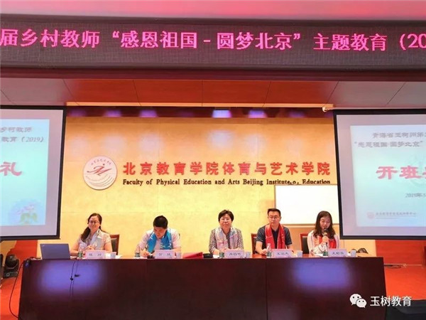 5月27日2019年青海省玉树州第三届乡村教师“感恩祖国·圆梦北京”主题教育活动开班典礼在北京教育学院黄化门校区举行。北京教育学院党委书记肖韵竹、北京市教委教育扶贫与合作支援处副处级调研员贺捷、青海省玉树州教育局党组成员、副局长王鸿杰、北京教育学院高级研修中心主任陈丽以及来自玉树州39位乡村教师参加了开班典礼。