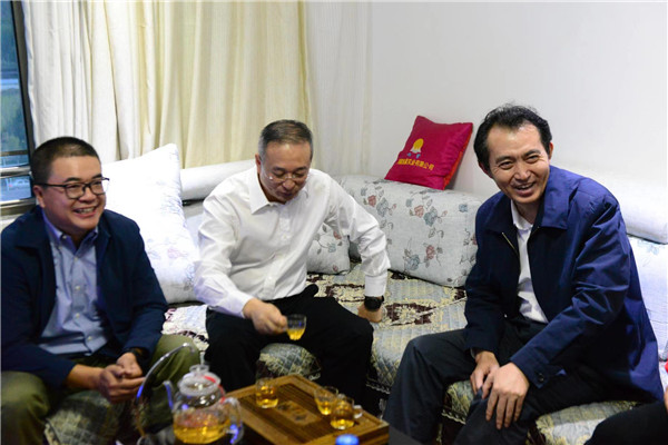 在拉萨北京中学刘杰校长的宿舍,正好遇到老师们正在这里品茶谈心,领导们兴致勃勃地加入,与老师们一同品茶畅谈,陈雍书记亲切地询问老师们的工作生活情况,看到老师们都已经适应高原生活,几位领导非常欣慰。