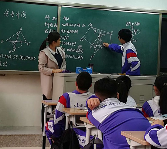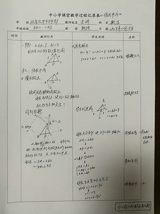 第二节课,我听了支晔老师的《倍长中线》,这是一节教材补充课,是在学完三角形和全等三角形的基础上进行的,既是全等三角形知识的巩固,又是阅读和探究题的拓展,为开发学生思维奠定了基础。