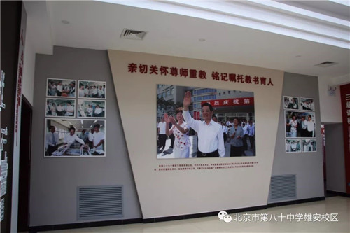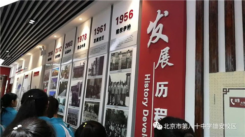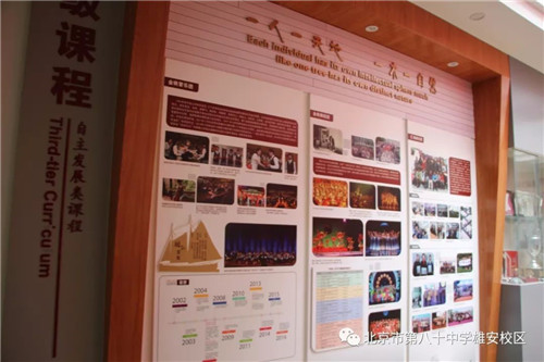 接着我们参观了校史馆。一张张照片记录了八十中的发展史,一幅幅图画描绘着八十中的美好过往。其中一张合照吸引了我们的目光,那是胡锦涛总书记当年来校考察时与田树林校长亲切交谈的场面。上书两行红色的大字“亲切关怀尊师重教,铭记嘱托教书育人”,彰显了总书记对教师的关心,对教育的重视。还有两棵“树“”也强烈的吸引了我们的注意力。看到这里您也许会纳闷:“怎么校史馆里还会种树?”其实那是两个树形的标识。那两棵“课程树”,包括了国家必修必选课还有人文课和艺术课,寓意着八十中的课程丰富多彩,八十中的学子必将茁壮成才。