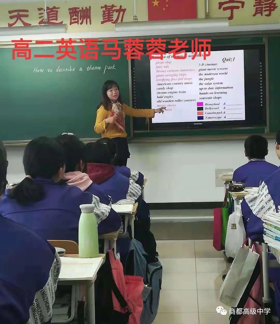 马蓉蓉老师所授的课题是how to describe a theme park?是一节作文课。首先,马老师用PPT呈现revison of themes or activity,复习theme park中应掌握的单词﹑短语。学生朗读PPT上面的单词和短语,然后用导学案上的words and expressios填短文,训练学生词语使用能力。回顾a theme park作文的结构三部分,Begining : basic information ;Main body :detailed information ; Ending :welcom or suggestions.根据上面的结构让学生写一篇作文,描写北京的欢乐谷(happy valley)。