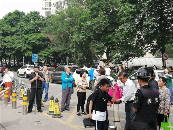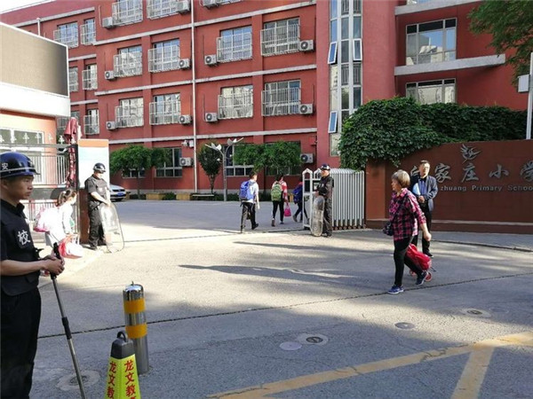 走到学校大门,就看到四位门卫保安人员,带着安全器械在校门口认真的保卫着进校学生的安全,顿时心中升起一股敬意!