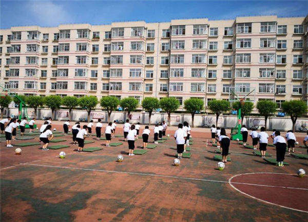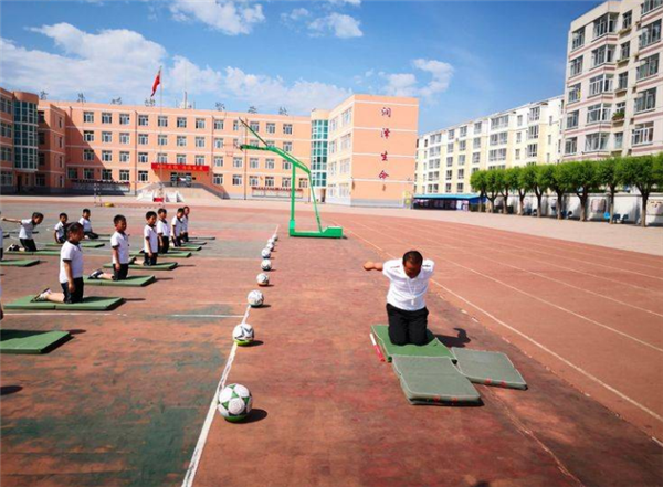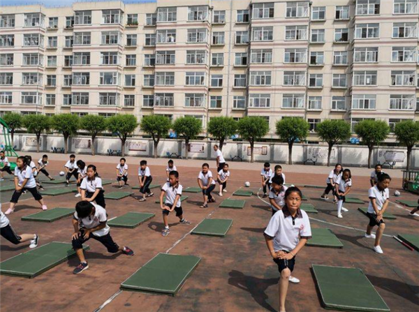 在米校长的带领下,同学们认真的做准备活动,米校长和学生的热身活动都很认真,动作也很规范。