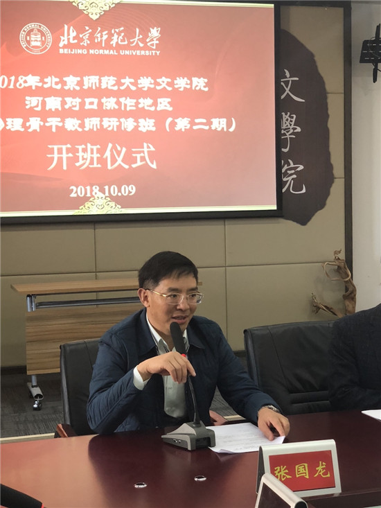 10月9日,北京师范大学-河南对口协作地区初中物理骨干教师高级研修班(第二期)开班典礼于北京师范大学主楼举行。北京师范大学文学院发展与合作中心主任张国龙、副主任张帆、河南省南阳市桐柏县城关一中袁国升及省教育厅选派的40位中学骨干教师出席典礼。典礼由张国龙主持。